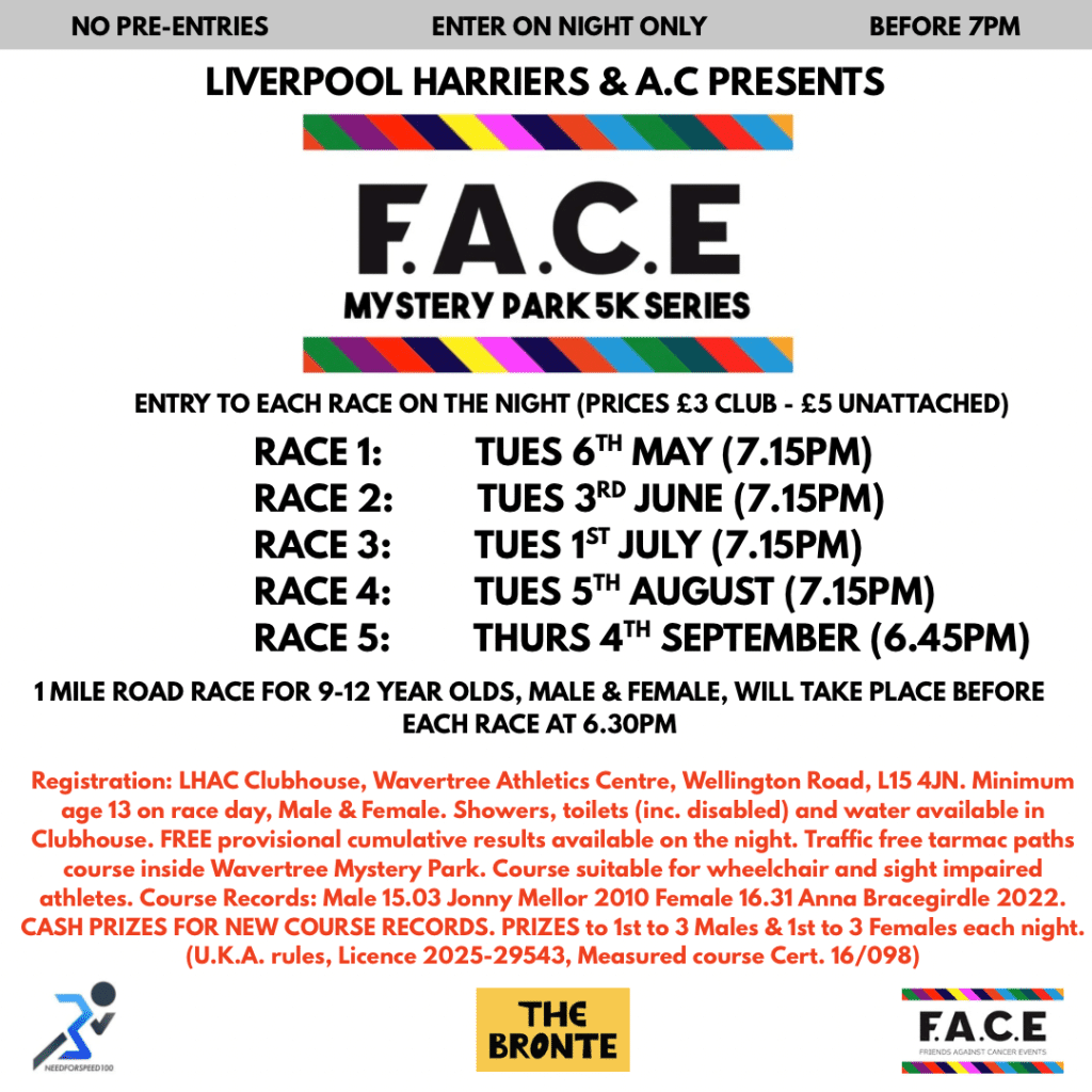 Featured in Club News The dates have been finalised with the first 5k starting on Tues 6th May Dates are as follows: 6th May 3rd June 1st July 5th August 4th September Previous Post Rebecca Murphy wins silver at Northern 5k champs and round Up Club News Cross Country Hurdles Jumps Road Running Sprints April 15, 2025 Next Post Northern Junior U13/U15/U17 Championships Wavertree Club News April 15, 2025 Attachment